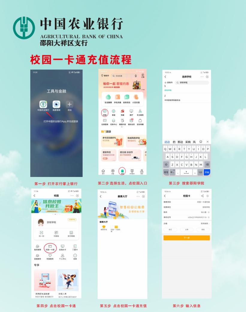 1.中国农业银行App充值:在完成校园卡激活后,①打开“中国农业银行”App,②选择“生活”,点击校园入口,③搜索并选择“邵阳学院”,④选择“我的缴费”,点击“校园一卡通充值”,⑤输入姓名和身份证号码,点击下一步,⑥输入预充值金额,点击缴费按钮,⑦选择银行卡完成充值。